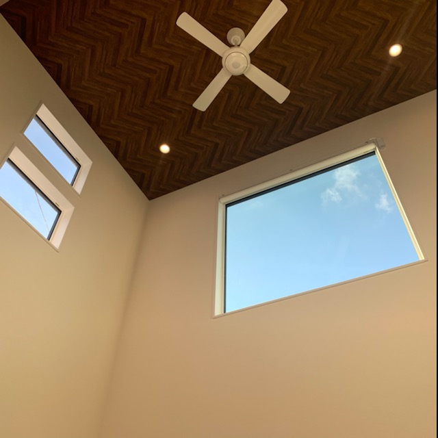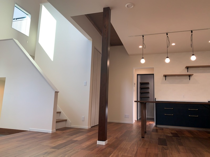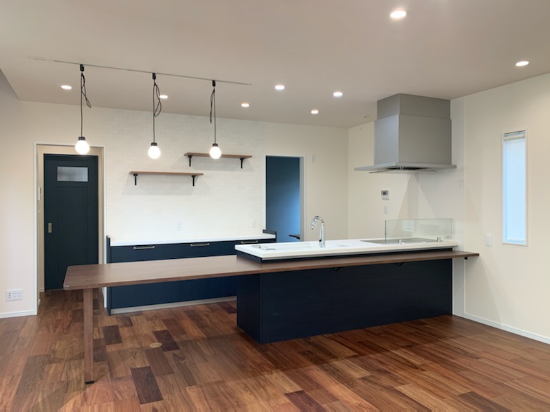 今回の「お洒落モダンな家」は、濃いブルーを基調とした外観に大胆な窓のレイアウトから差し込む光や、玄関や内装にウッドを使った温かいなかにもお洒落さをあしらったスタイリッシュモダンな家を目指しました。