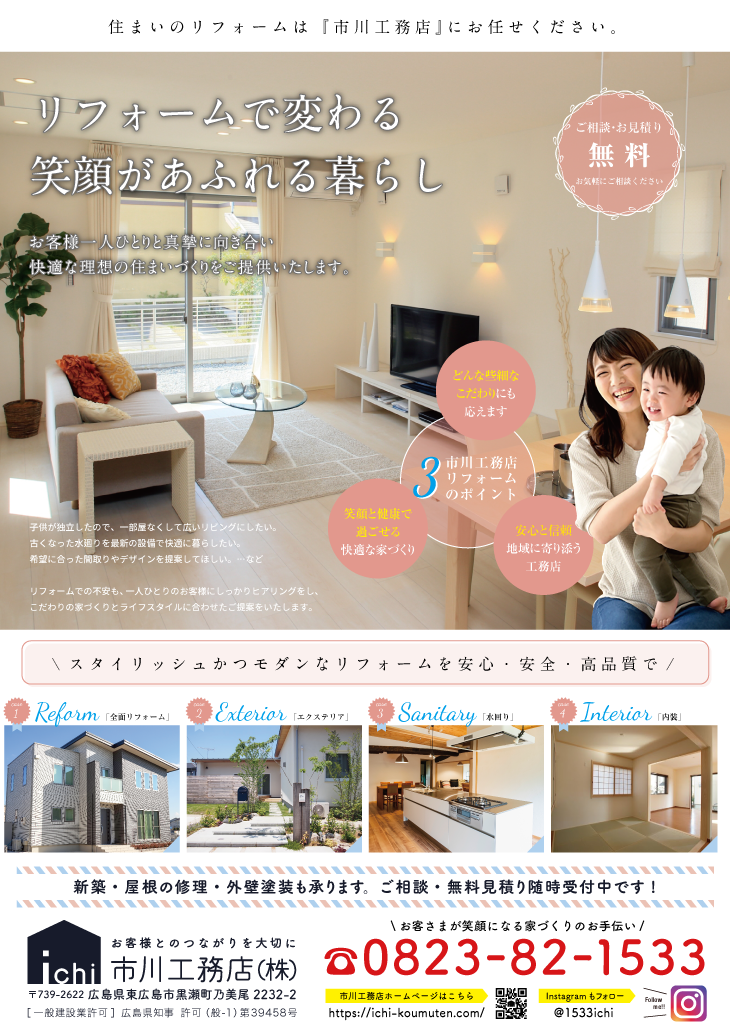 新聞折込のお知らせ【5月1日】 2021年5月1日 お知らせ イベント情報 2020年5月1日(土)中国新聞(黒瀬エリア)の朝刊チラシ折り込みいたします。 今回はお家のリフォームについてご紹介しております。 お家が古くなったり、家族構成が変わったり、快適な水まわりにしたいなど、リフォームをお考えの方。 初めてのリフォームでの不安も、一人ひとりのお客様にしっかりヒアリングをし、こだわりの家づくりとライフスタイルに合わせたご提案をさせていただきます。 気になる方は、お気軽に市川工務店にご相談ください。