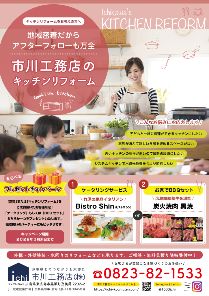 引き続き2022年3月末日までに、「新築」または「キッチンリフォーム」をご成約のお客様に、竹原の絶品イタリアンの「Bistro Shin(ビストロシン)」のケータリングサービス、または、広島血統和牛の元就も堪能できる「炭火焼肉 黒焼」のBBQセットをプレゼントさせていただきます。