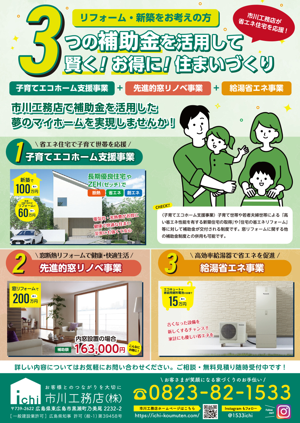 補助金のお知らせ 2024年6月13日 お知らせ イベント情報 注文住宅と窓断熱リフォームで健康・快適生活!! 今なら補助金「子育てエコホーム支援事業」と「先進的窓リノベ事業」と「給湯省エネ事業」を活用することで、新築で最大100万円、窓リフォームで最大200万円の給湯省エネで最大15万の補助を受けることができます。また3つの補助金を併用することで、もっと賢くお得に利用することもできます。 今回で多分最後になる補助金だと思います!この補助金でサッシを変えられた方は部屋が暖かくなったと言われてます。※この機会にぜひご相談下さい!